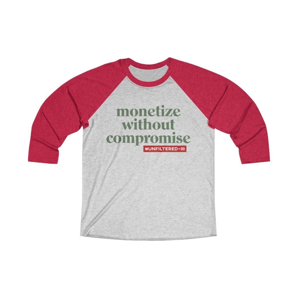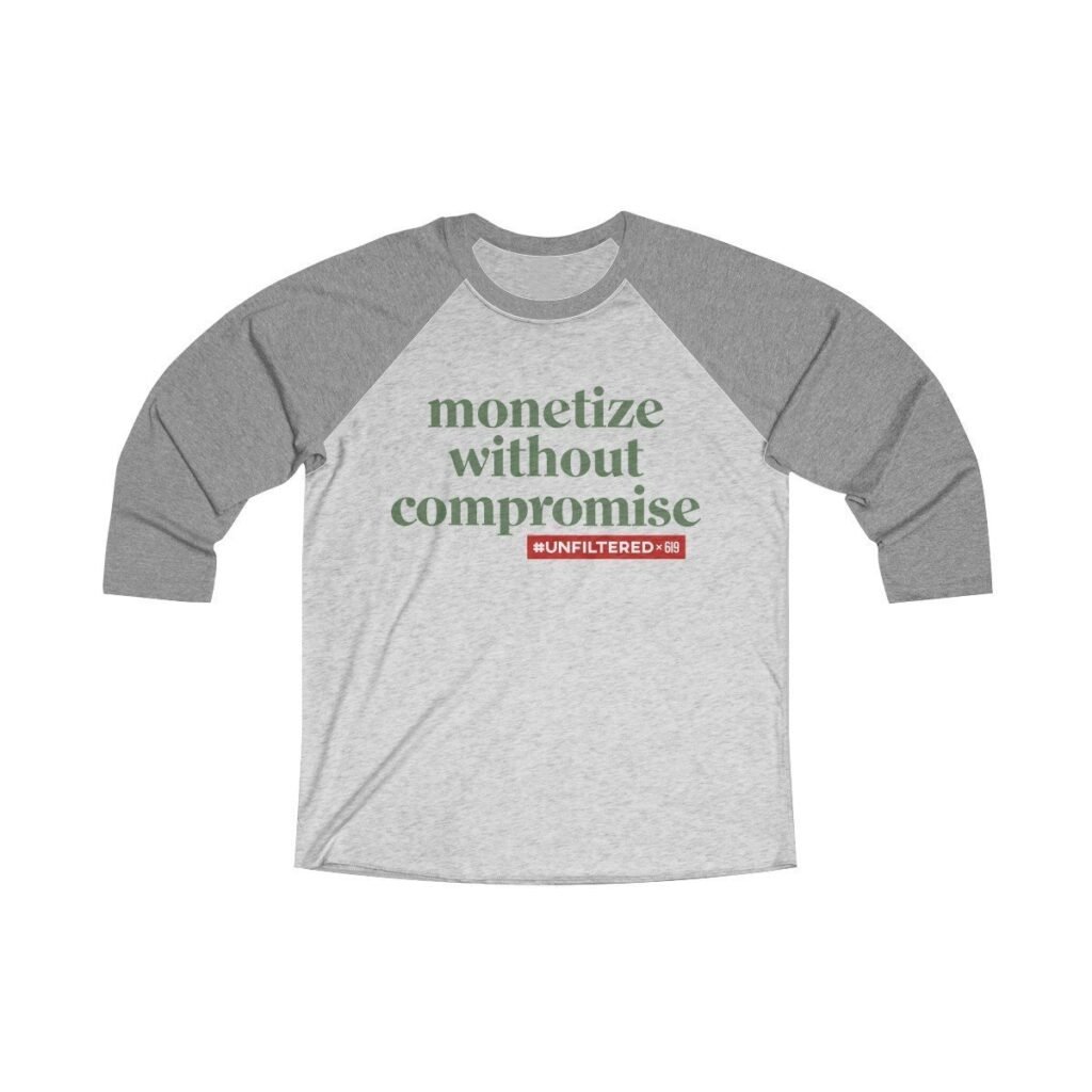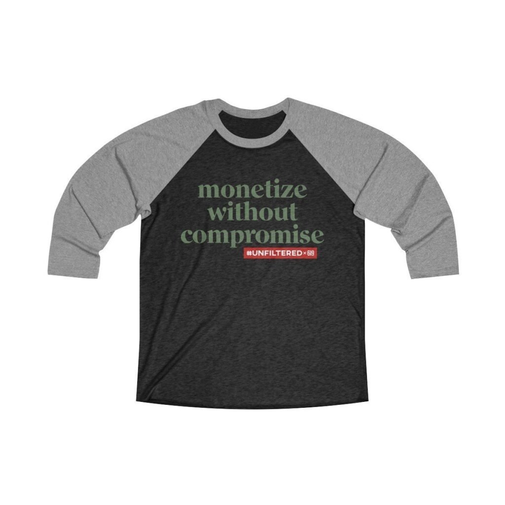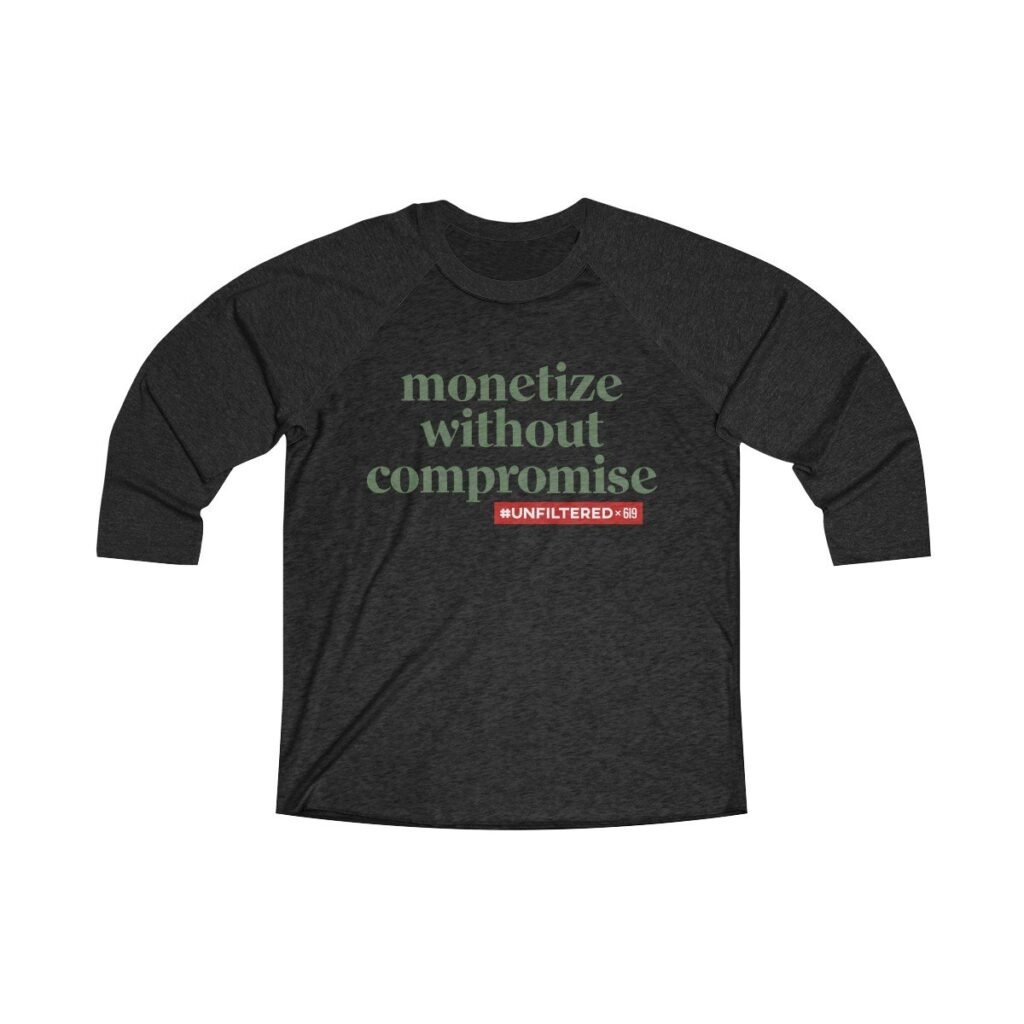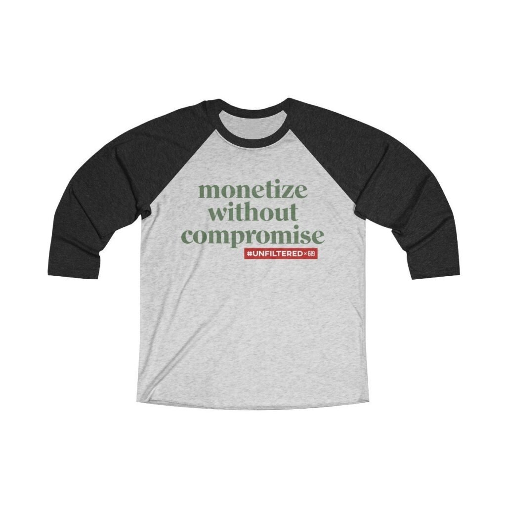 What if we told you it’s ok to get paid for your talents? Find the balance between your livelihood and your passions and feel good about it in our stylish, unisex raglan t-shirt reminding you to, “Monetize without compromise.” These are words to live by, #unfiltered.