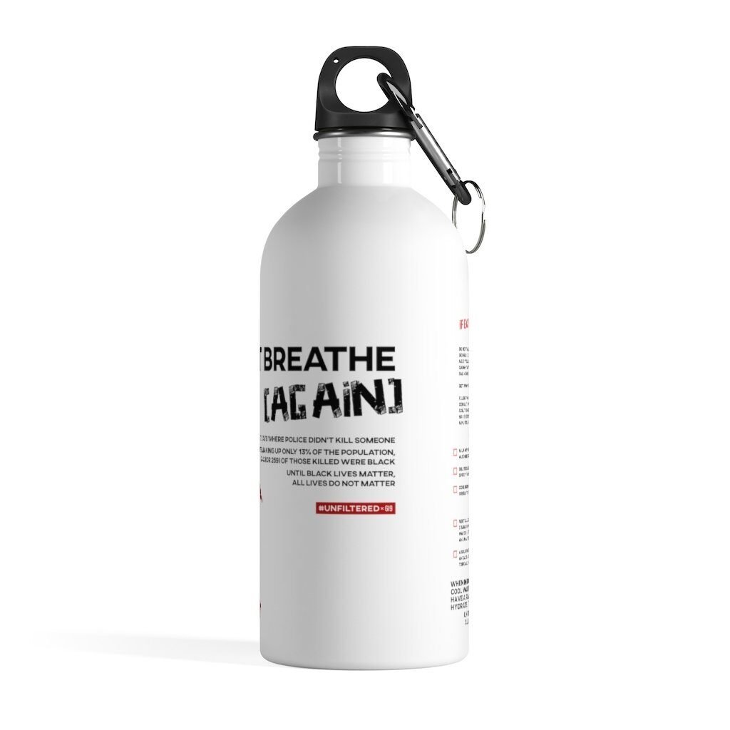 Whether jogging through the park or marching through the streets, hydration is not only essential, but can be life-saving. We’ve included some emergency guidelines on the back if you find yourself confronted with tear gas or pepper spray, as well. Clip to your backpack or belt using the sturdy carabiner and know the contents are leak-proof with your screwtop safety lid.
